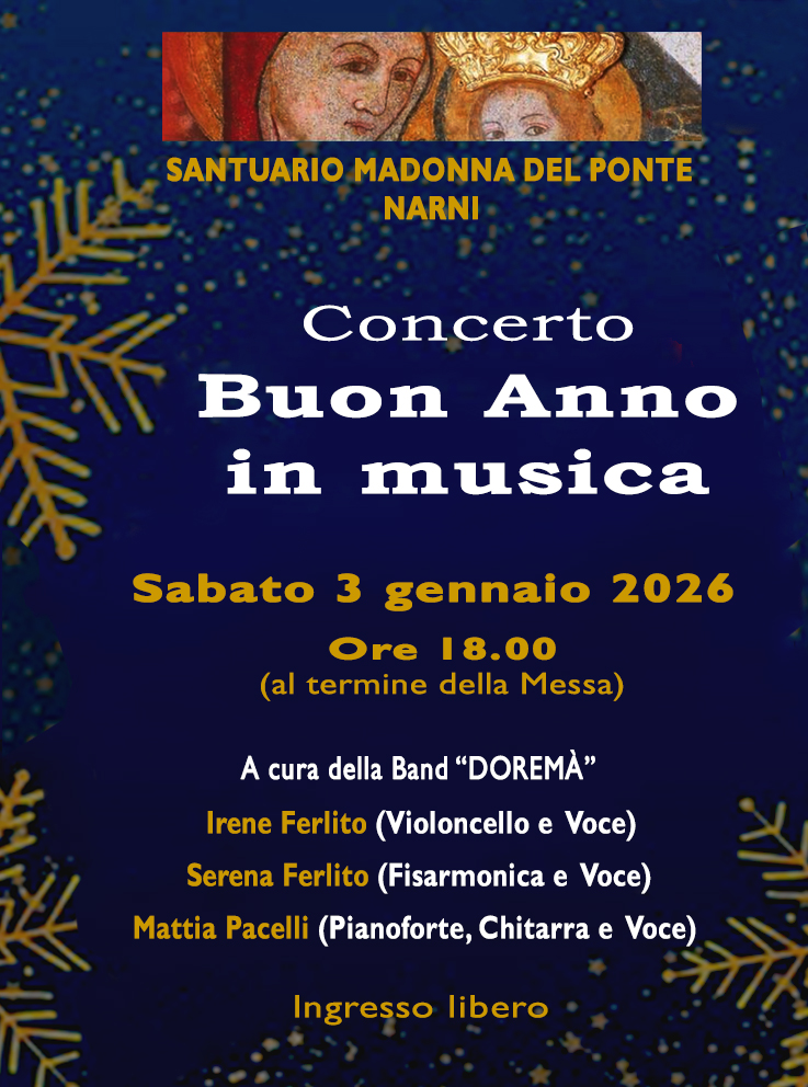 Nell'ambito delle iniziative, che fanno parte del ricco cartellone di "Narnia Natalis" allestito dal Comune di Narni, sabato 3 gennaio alle 18, presso il santuario della Madonna del Ponte avrà luogo un concerto a cura dei Doremà.
