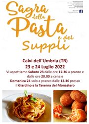Due fine settimana all'insegna delle buone tradizioni culinarie locali e del divertimento. Il tutto unito alla possibilità di visitare i siti culturali che offre il paese. E' la Pro Loco di Calvi dell'Umbria (Terni) ad organizzare due week-end ricchi di buoni sapori e di musica da ballo. Sabato 23 e domenica 24 si comincia con la "Sagra della Pasta", un classico al quale quest'anno gli organizzatori hanno deciso di aggiungere un'altra specialità locale: il supplì. Pasta e supplì sono il piatto forte della cucina casereccia di questa parte dell'Umbria, e Calvi si è sempre distinta nel portare in tavola questo tipo di piatti. La Pro Loco, per l'ora di pranzo nelle due giornate, da appuntamento agli avventori presso la Taverna ricavata all'interno dell'antico Monastero che per alcuni secoli ha ospitato le suore Orsoline. Alla sera, invece, si potrà mangiare sia all'interno che nei grandi giardini adiacenti il Monastero che si trasformeranno in un grande spazio dove poter gustare al fresco le specialità del posto. In cucina si alterneranno le cuoche del paese, che con mani sapienti prepareranno sughi e condimenti che danno dei formidabili sapori ai piatti che verranno portati in tavola.