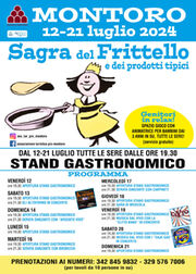 Torna a Montoro dal 12 al 21 Luglio la "Sagra del frittello". Dopo quattro anni di stop si potranno di nuovo gustare i caratteristici frittelli, presso lo stand gastronomico aperto tutte le sere dalle 19,30 presso lo spazio del centro civico. Baccalà, cicoria, patate, fiori di zucca di nuovo impastellati e fritti come tradizione vuole, e un nuovo frittello, quello con la cipolla, che si preannuncia un pezzo forte della proposta gastronomica. Immancabili i rinomati gnocchi al Castrato da gustare insieme a tante altre proposte del territorio. "Abbiamo voluto fortemente questa ripresa - afferma Claudio Guazzaroni, il presidente della ProLoco Montoro - e creduto che la Sagra del frittello, oltre ad essere un evento che caratterizza l’Estate Montorese, fosse innanzitutto un modo per stare insieme e rivitalizzare la nostra Comunità. Con la sagra tanti di noi sono cresciuti e questa iniziativa è per noi un punto di riferimento e un’occasione nella quale investire tutte le nostre energie". Al fresco del giardino del centro civico sono in programma tre serate danzanti con le orchestre più in voga del momento ed altre serate con gruppi musicali, tra i quali quello degli Altoforno nella loro formazione completa. Montoro pensa anche ai bambini e ai genitori con la proposta “Genitori in relax”, uno spazio gioco gratuito con animatrice per bambini dai 3 anni in su.