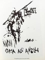 Un'immagine che tutti conoscono e che caratterizza da decenni il logo della Corsa all'Anello di Narni. Non tutti sanno, tuttavia, come è nata questa immagine e chi, tanto tempo fa, l'ha realizzata. A ricordarlo ai narnesi è stato recentemente Edoardo Antonini, appassionato di storia locale. "Nel 1970 - spiega -, il Consiglio Direttivo del costituito Ente Corsa all'Anello, presieduto dall'onorevole Filippo Micheli, si trovò a dover decidere di assegnare un simbolo alla manifestazione per rappresentarla degnamente. L'amico Mario Valle, nominato vicepresidente, ebbe l'incarico di risolvere il problema e aiutato da Romano Antonini, chiamò a Narni il dottor Felice Fatati, il quale, dopo vari tentativi, scelse l’immagine che divenne il manifesto ufficiale della Corsa all'Anello. I tre amici si incontravano presso la dimora di Mario Valle, nella località 'La Scogliara', dove prese forma il disegno di un cavaliere al galoppo che, con la lancia da torneo, infilava un anello. I vari bozzetti - ricorda Antonini -, furono sottoposti all'attenzione del Presidente dell’Ente Corsa Filippo Micheli che scelse quello che ancora oggi è il logo ufficiale dell'associazione che organizza la Corsa all'anello. Il dottor Fatati realizzava i suoi disegni nel tratto di strada che dalla Rocca Albornoz arriva alla fonte Feronia e Romano Antonini, contemporaneamente, immortalava la scena. Dal connubio di Mario Valle, che rappresentava il cavaliere e della sua cavalla 'Italia' nacque il manifesto di Felice Fatati, la cui firma compare in basso a destra del disegno, sotto forma di un ciuffo d'erba. Nei primi anni della rievocazione storica, il manifesto e il relativo programma degli eventi venne affisso in tutta la regione ed Ennio Santarelli, dirigente dell'ente Corsa, lo fece affiggere anche alla stazione Termini di Roma e sugli autobus della Capitale. In sintesi - conclude Antonini -, questa è la storia della nascita del manifesto ufficiale della manifestazione narnese che ogni anno attira turisti che ammirano anche le bellezze artistiche della nostra città. Ci auguriamo che il 'Cavallo di Fatati', come venne subito definito, rimanga in futuro a rappresentare la nostra bella manifestazione".