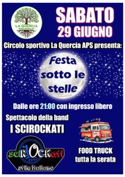 L'idea è quella di coinvolgere quanta più gente possibile a trascorrere una bella ed allegra serata sotto alle stelle. in una delle zone collinari intorno a Narni Scalo, dove un minimo di frescura è sempre garantito. L'appuntamento è quello organizzato per sabato 29 giugno, a partire dalle 21, dal Circolo sportivo "La Quercia Aps". Presso il grande impianto del circolo avrà luogo una festa ad ingresso libero, che vedrà sul palco la band degli "Scirockati", un gruppo composta di cinque elementi: basso, batteria, tastiere, chitarra elettrica e voce. La band, nel corso dei suoi spettacoli, molto coinvolgenti, propone un vasto repertorio che va dalla musica dance e commerciale a quella rock e pop, con i successi più noti ed orecchiabili in grado di far ballare e cantare un pubblico molto etereogeneo, dai più piccoli, fino agli anziani. Gli organizzatori ricordano che a disposizione del pubblico, per tutta la serata, ci sarà un'offerta gastronomica varia e gustosa grazie alla presenza di food-truck presenti all'interno del circolo. "Ci piace - dicono gli organizzatori - salutare così l'inizio dell'estate e ci proproniamo di ripetere questo tipo di serate da qui a settembre. Stare insieme, in modo semplice e divertirci tutti insieme, crediamo sia una delle cose più belle che associazioni come la nostra possano organizzare".