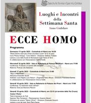 Sono numerosi e tutti importanti gli appuntamenti in programma per la "Settimana Santa" presso la cattedrale di Narni. Agli eventi è stato dato il nome di "Ecce Homo - Luoghi e Incontri della Settimana Santa - Anno Giubilare". Domenica 13 aprile si è svolta la "Passio Domini nostri Jesus Christi secundum Lucam" di O.di Lasso. Coro Musica Antiqua - Coro Naharti diretto da Stefania Trabalza, con le letture a cura della Scuola di Recitazione CGS-Tacito di Terni