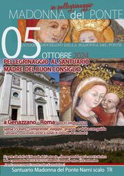 Sabato 5 ottobre il Santuario Diocesano della Madonna del Ponte di Narni organizza un pellegrinaggio al Santuario Madre del Buon Consiglio di Genazzano (Roma). Il costo per partecipare all'evento è di 55 euro pro capite e comprende: viaggio, pranzo e visita con guida a disposizione per il santuario e le escursioni ai luoghi di interesse del territorio. La partenza è prevista alle 6,45 dal piazzale antistante il Santuario Madonna del Ponte a Narni Scalo e il ritorno previsto per le 19,00 circa sempre al piazzale. Per informazioni e prenotazioni, da effettuarsi entro il 29 settembre, il numero da chiamare è: 335.8142325 Roberto Leonardi. I posti verranno assegnati secondo l'ordine di prenotazione.