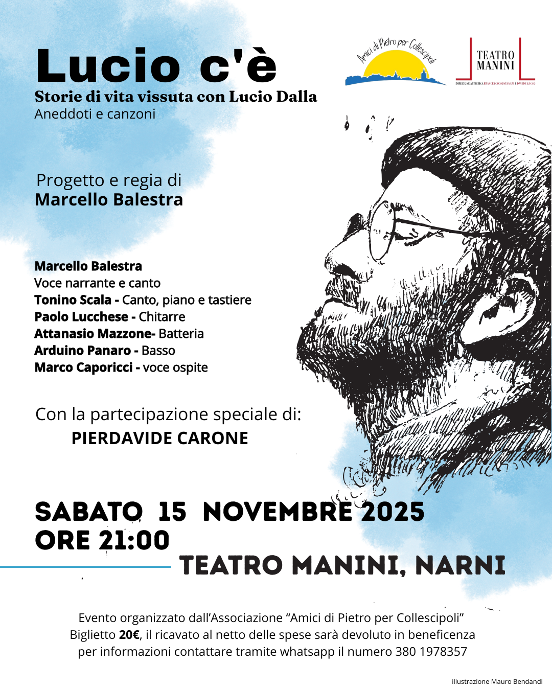 Si intitola "Lucio c'è" ed è lo spettacolo musicale in programma sabato 15 novembre alle 21 al Teatro Manini di Narni. "Si tratta - spiegano gli organizzatori -, di un concerto-racconto originale, scritto, narrato e diretto da Marcello Balestra, storico collaboratore e amico per trent’anni di Lucio Dalla.