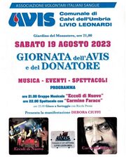 Sabato 19 agosto torna a Calvi dell'Umbria la "Giornata dell'Avis e del donatore". La manifestazione è organizzata dalla locale sezione Avis. Si tratta di una serata dedicata alla solidarietà ed alla promozione della donazione. Verrà installato un gazebo dove sarà possibile avere tutte le spiegazioni relative alla donazione di sangue e di plasma, con la possibilità di iscriversi e diventare donatori. La serata, che si svolgerà a partire dalle 21 presso i giardini del Monastero, sarà allietata dal gruppo "Eccoli di Nuovo" e dal noto cabarettista di Colorado "Carmine Faraco". Dopo lo spettacolo comico avrà luogo un gioco a sorteggio con ricchi premi.
