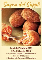 E' diventata un classico delle estati calvesi. Una sagra molto gradita, che richiama ogni anno tantissima gente nella cittadina posta ai confini tra Umbria e Lazio. Si tratta della "Sagra del supplì", in programma a Calvi dell'Umbria nelle serate di sabato 22 e domenica 23 luglio. L'appuntamento per gli avventori è presso il giardino e la Taverna ricavata all'interno dell'antico Monastero che per alcuni secoli ha ospitato le suore Orsoline. Il supplì è una specialità molto diffusa ovunque, ma, a sentire gli organizzatori, della sagra calvese, "i nostri sono ancora più buoni, provare per credere". Per coloro che decideranno di arrivare a Calvi con qualche ora di anticipo, c'è la possibilità di fare una escursione nei vicoli del centro storico, dove si possono ammirare, oltre a degli scorci davvero suggestivi, i tanti "Murales", realizzati molti anni fa da numerosi artisti ed aventi come tema quello del Natale ed il museo cittadino, ricco di pregevoli opere d'arte. Le innumerevoli "finestre" naturali che si aprono di tanto in tanto alla vista del visitatore, passeggiando tra le viuzze del borgo, consentono di gettare lo sguardo verso l'orizzonte e di ammirare un panorama magnifico che si apre, partendo da destra, con i tanti paesi dell'amerino e dell'orvietano. Al centro le "creste", formate dai monti Cimini, fanno da contraltare al frequente "luccichio" del Tevere che scorre nelle ampie vallate sottostanti, mentre a sinistra, completano l'originale 'belvedere', l'austera maestosità dei monti Soratte, Cavo e Gennaro, con le tante località della parte alta della Sabina e del Tiburno che si stagliano all'orizzonte. Insomma, farsi un giro per Calvi e puntare lo sguardo verso sud è uno spettacolo davvero unico. Ed il piacere aumenta se l'escursione ottica viene fatta con un buon binocolo.