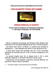 Il Santuario Diocesano della Madonna del Ponte di Narni partecipa agli esercizi spirituali di Avvento che avranno luogo dal 18 al 30 novembre presso la Casa di preghiera di Collerisana di Spoleto. Il nome dato a questa importante iniziativa è "Con Giuseppe verso Betlemme". Per coloro che da Narni e comprensorio volessero aderire, potranno farlo entro domenica 23 novembre chiamando Monsignor Giorgio Brodoloni (339.7380775). Il corso inizierà venerdì 28 novembre alle 17 e terminerà domenica 30 novembre alla stessa ora. La quota complessiva è di 100 euro. Le camere singole sono 24, le doppie sono 4. Se ci saranno particolari esigenze, gli organizzatori cercheranno di tenerne il dovuto conto. Ritrovo e partenza dal piazzale del Santuario della Madonna del Ponte alle 15.30. Chi partirà direttamente da Terni, lo dovrà far presente. Gli organizzatori suggeriscono di inserire nello "zaino" la Bibbia, un quaderno per annotare le meditazioni e "tanto desiderio di aprire il cuore all'azione di Dio".