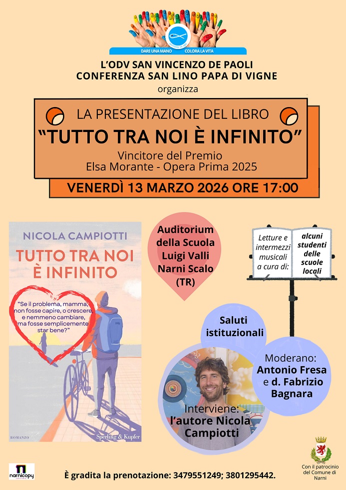 Venerdi 13 marzo alle 17, presso l'auditorium della scuola "Luigi Valli" di Narni Scalo, la Conferenza San Lino Papa di Vigne (O.D.V. San Vincenzo De Paoli) organizza la presentazione del libro "Tutto tra noi è infinito". "Si tratta - spiegano gli organizzatori -, di un'occasione di confronto e crescita per tutta la cittadinanza, in particolare per i giovani. All'evento, patrocinato dal Comune di Narni, saranno presenti l'autore Nicola Campiotti, il Prof. Antonio Fresa e don Fabrizio Bagnara come moderatori.
