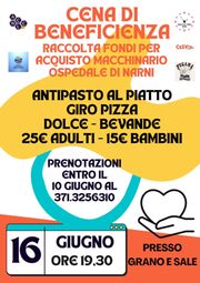 World Associazione Aiutaci per Aiutare, l'Associazione Lotta Contro il Cancro di Narni, la Banca del Tempo, Cesvol ed i Picari organizzano, domenica 16 giugno, una cena di beneficenza che si pone lo scopo di raccogliere fondi da destinare all'acquisto di un macchinario da donare all'ospedale di Narni. La cena avrà luogo presso il ristorante narnese "Grano e Sale". Per informazioni e prenotazioni è possibile telefonare al numero: 371.3256310.