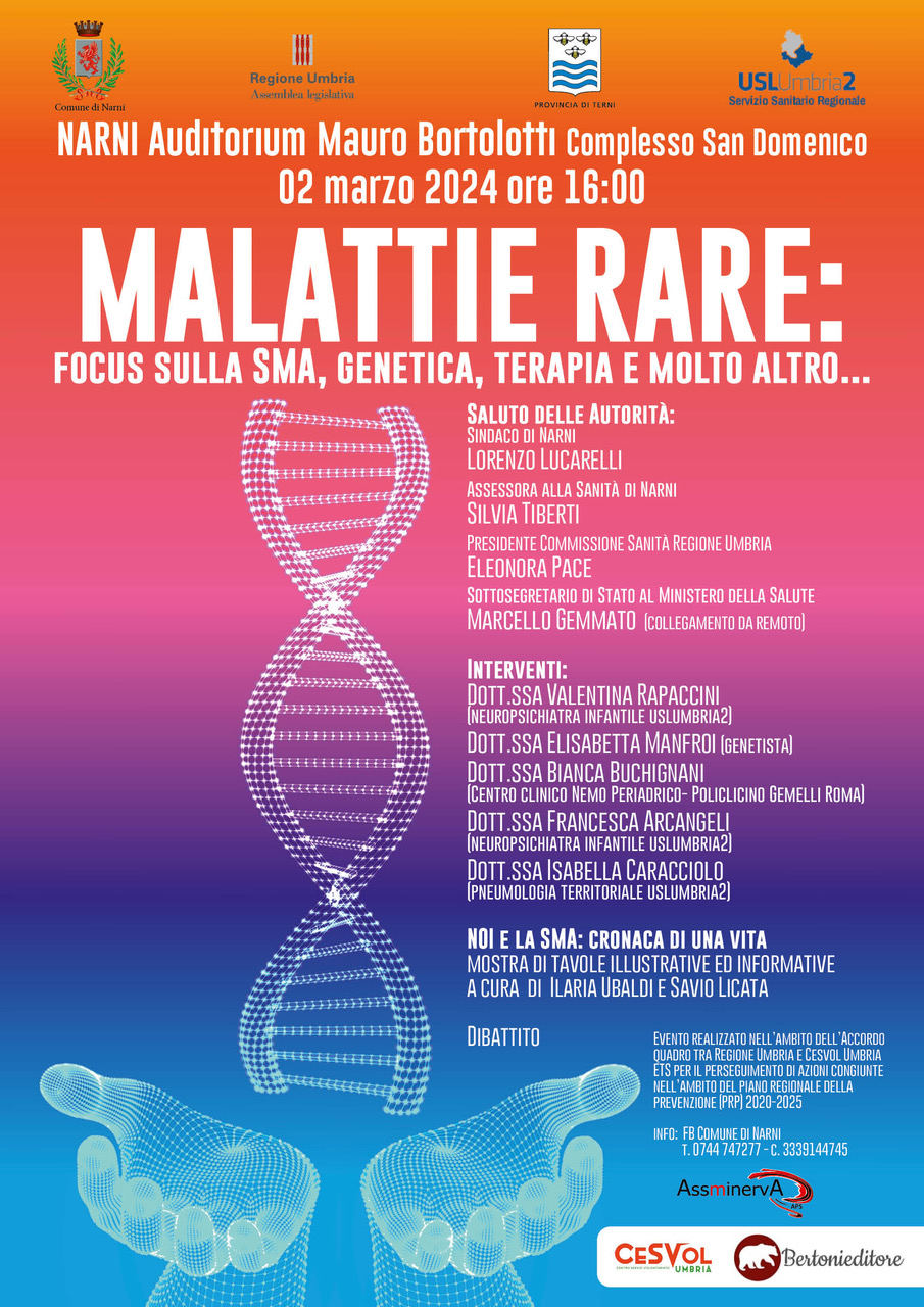 Narni: sabato 2 marzo al San Domenico convegno su "Malattie rare: focus sulla Sma, genetica, terapia e molto altro"