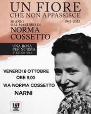 Venerdì 6 ottobre alle 9, il "Comitato 10 Febbraio", rappresentato a Narni dalla consigliera comunale Rebecca Poggiani, organizza un evento sotto alla targa che ricorda Norma Cossetto, nell'omonima via a Narni Scalo. La manifestazione ha come titolo "Una rosa per Norma, un fiore che non appassisce". L'evento intende ricordare la giovane Norma ad 80 anni dal suo martirio, avvenuto nel 1943. "Con questa cerimonia - spiega Rebecca Poggiani -, desideriamo ricordare la nobilissima figura della medaglia d’oro al merito civile, Norma Cossetto, che nel lontano ottobre 1943 pagò con la vita la sua fede nell’Italia. Norma Cossetto, quando decise di non rinnegare la propria italianità, pagò con la vita questa scelta coraggiosa. Venne sequestrata, torturata, violentata e gettata, sembra ancora viva, nella foiba, profonda 130 metri, di Villa Surani, oggi in territorio della Repubblica di Croazia. Noi tutti - ha aggiunto la Poggiani -, dobbiamo parlare di Norma Cossetto, della Medaglia al Merito Civile che le venne conferita dal Presidente della Repubblica Ciampi, dei Martiri delle Foibe, del dramma degli Esuli; raccontiamo la storia, difendiamone il ricordo. Facciamolo per loro, per noi e per i nostri figli".