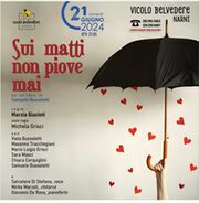 Venerdì 21 giugno alle 21.30 al Vicolo Belvedere di Narni avrò luogo un evento inedito in occasione della prima notte d’estate sotto le stelle tra i profumi e i colori delle essenze del suggestivo vicoletto. Qui andrà in scena una serata musicale allegra e divertente dal titolo curioso “Sui matti non piove mai” per la regia di Marzia Giacinti. Lo spettacolo è nato da un’idea dell’associazione Vicolo Belvedere. "Ci sarà - dicono gli organizzatori -, tanta bella musica e delle spassose riflessioni sul tema della felicità, grazie a personaggi in bilico tra normalità e follia, che ci mostreranno come dalle crepe della nostra sensibilità, possano entrare le emozioni più belle". La serata registra il sold-out ormai da settimane.