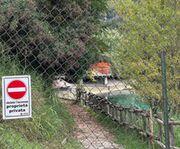 (La foto mostra il sentiero dal quale si accede al solarium delle Mole, che è stato chiuso con una rete, con affisso il cartello "Proprietà privata")