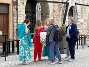 Romina Power a Narni. La nota cantante ed artista è arrivata in città sabato mattina (18 maggio) per partecipare al matrimonio di una sua amica. La presenza dell'ex moglie di Al Bano Carrisi non poteva passare inosservata. La nota attrice, figlia del grande Tyrone Power, ha scelto il rosso come colore da indossare in questa speciale occasione: sopra una blusa floreale a sfondo rosso, sotto un paio di pantaloni dello stesso colore, scarpe in tinta, al pari degli occhiali; una giacca color panna, ornata da fregi floreali, portata su un braccio. Quando chi si è trovato a passare in piazza dei Priori a quell'ora ha notato la signora Power, non ha perso l'occasione per avvicinarsi e per scambiare con lei due parole. La ex signora Carrisi è stata cordiale e disponibile con tutti, confermando quei suoi modi gentili e garbati noti al pubblico televisivo. Per la cronaca il matrimonio ha avuto luogo presso la sala consiliare del Comune di Narni ed a celebrare la cerimonia è stata la vice sindaco Alessia Quondam. Nella foto ( scattata da Marco Santarelli), si vede di spalle il fotografo narnese Marco Menciotti, reporter ufficiale della cerimonia, mentre scambia due battute con l'artista.