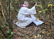 Nelle foto alcuni momenti della Messa celebrata da don Fabrizio nel bosco di Taizzano dove nel sottosuolo si troverebbe un cimitero abbandonato nel lontano 1937)