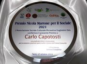 Carlo Capotosti è stato insignito del "Premio Nicola Marrone per il Sociale 2021". Si tratta di un riconoscimento importante, che viene assegnato, ogni anno, a persone e associazioni che abbiano dato un contributo nel campo del volontariato, della promozione sociale, della tutela ambientale, della cultura e del giornalismo. Il premio venne istituito l'11 giugno 2011 nel primo anniversario della scomparsa di Nicola Marrone che, il 22 gennaio 1989, fondò il primo Centro Sociale del Comune di Terni, il "Guglielmi", del quale divenne presidente e guida per i successivi diciannove anni. Su suo impulso l'Associazione ha partecipato, nel 1990, alla costituzione di Ancescao (Associazione Nazionale Centri Sociali, Comitati Anziani e Orti). Per Carlo Capotosti si tratta dunque di un premio importante e molto gratificante sotto il profilo umano. "I Consigli Direttivi delle associazioni promotrici - si legge nella motivazione che ha indotto gli organizzatori a premiare il nostro concittadino - comn profonda stima e riconoscenza per la costante e preziosa opera svolta in favore dell'intera Comunità". La cerimonia di premiazione ha avuto luogo domenica 17 ottobre presso i locali della Bioblioteca Comunale di Terni in piazza della Repubblica.